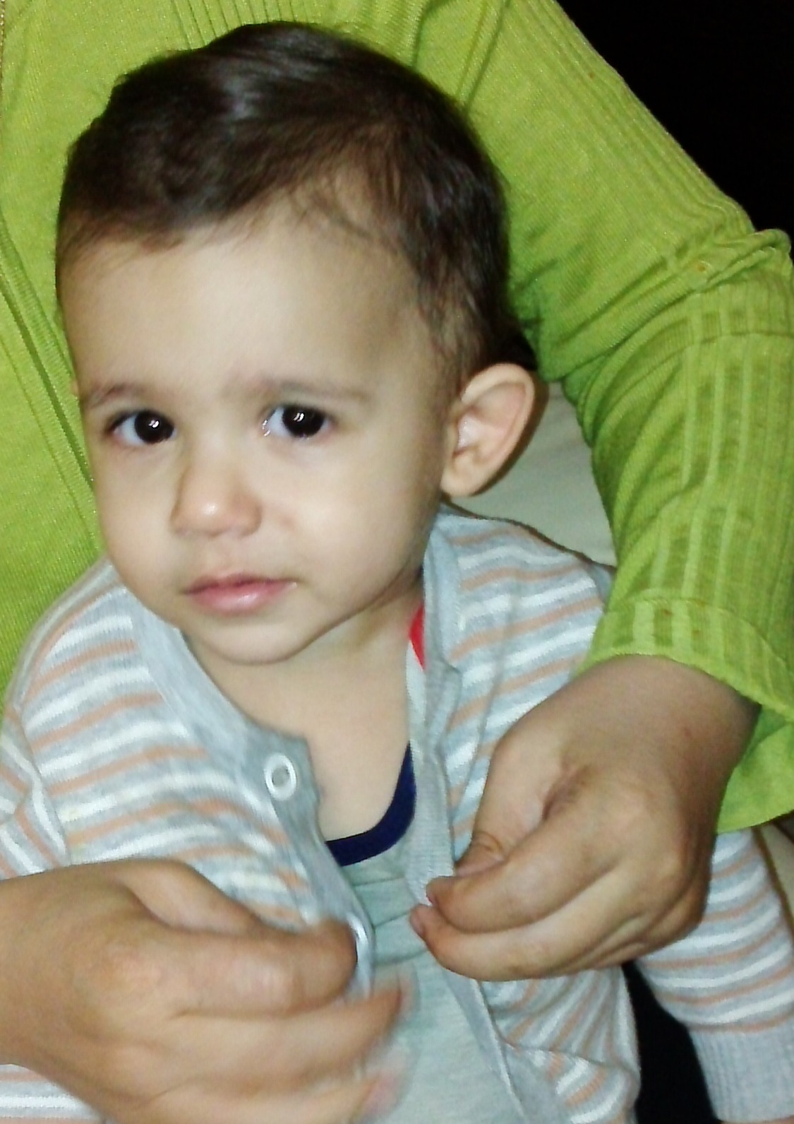 شب ساعت 12.5 بود که رسیدیم به خونه ی خودمون و شما هم خواب بودی. تا صبح بدنت داغ بود و پاشویه میکردم و میخوابیدی. تا اینکه دیدم دونه ها همینجوری داره کل سطح صورتت رو میگیره و به پشت گوشهات هم رسیده و خیلی بی قرار بودی. مامان جون تماس گرفتن و گفتن ممکنه مخملک گرفته باشی. کمی هم گلودرد داشتی. بابا موقع برگشت به خونه وقت دکتر گرفت و آقای دکتر گفتن که همون اگزماست و بخاطر حساسیته و احتمالا هم همون حساسیت غذائیه. یه پماد ساخنتی داد و اومدیم خونه. در اینجور مواقع من برات روغن بنفشه هم میزنم که تسکین دهنده ی خارش و کمی هم خواب آوره. خونه که رسیدیم یه حمامت کردیم و مقداری سرحال تر شدی و ساعت 12 شب بود که خوابت برد و تا الان هنوز خوابی. البته نیمه های شب بیدار شدی و شیر خوردی و از 6 صبح به بعد هر دوساعت بیدار میشی و شیر میخوری. و یکبار هم بدنت رو روغن مالی کردم.